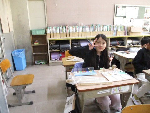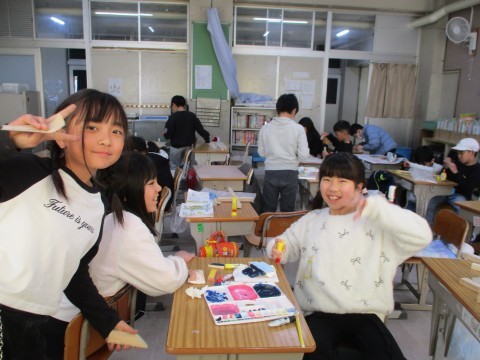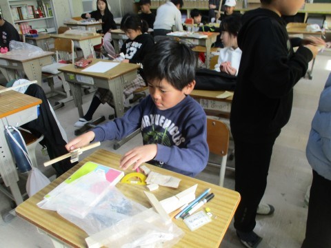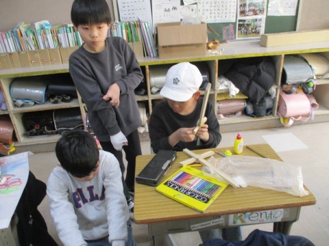 切った木材を「つなげて」「重ねて」「合わせる」で,作品を作っています。出来上がった作品に絵の具で色をぬっています。