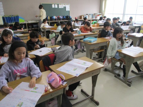国語テストのやり直しをしています。自分の間違いを確かめながらていねいに書き直しています。