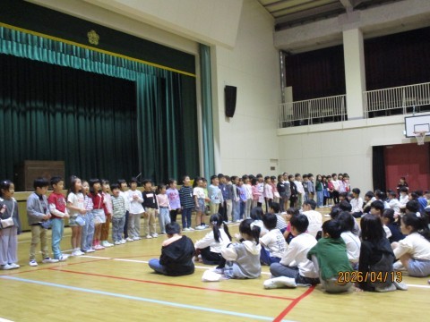 対面式では、朝礼に初めて参加した1年生が、可愛らしくあいさつができました。また、そのあとの任命式では、5・6年生の代表委員が任命証をもらい、意気込みを伝えられました。