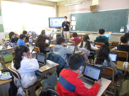 1組は,プログラミングの学習です。キャラクターを自分のプログラムで4方向に動かすことができるかやっていました。子どもたちはあっという間にこつをつかんで,楽しんでいました。