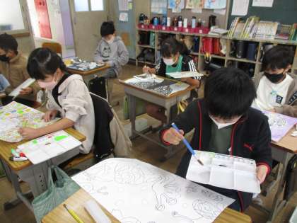 2組は,お話の絵の仕上げです。細かいところもていねいに塗っています。