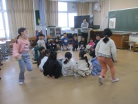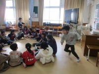 2組は、色紙を細かく切ったものを紙にきれいに貼っていました。このあと、これを使って何かを作るのだそうですが、床もきれいに折り紙だらけになっている子もいて、先生が「掃除したばっかりなのに・・・」と嘆いていました。