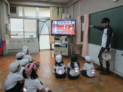 体力テストに向けて説明のビデを見ています。握力、シャトルラン、立ち幅跳びなど、どうすればいいのか映像で分かりやすく説明をしています。子どもたちからは、失敗の例を見て笑い声もあがっています。