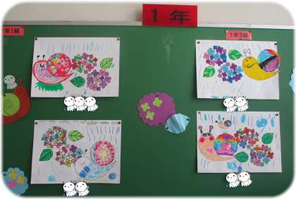 おしゃれななかたつむりさんです。雨が降ってアジサイの花も喜んでいるようです。