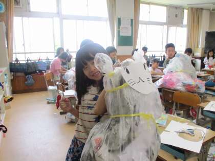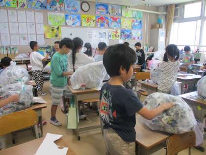 大きな袋にくしゃくしゃにした紙を詰め,思い思いの形にひねったり飾りをつけたりしています。工夫をこらした、楽しい作品が出来上がる予感がします。
