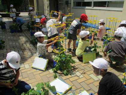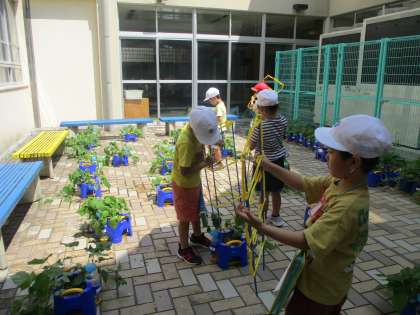 「うん,いい感じ。もうちょっとだ。」「この支柱の上までアサガオの花でいっぱいにしたいなあ。」毎日の世話を欠かさず行っている子供たち。子供たちとアサガオのどちらも成長が楽しみです。