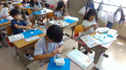かたつむりやあじさい、雨やかさ、かえるやみずたまりなど思い思いの梅雨を表現していました。