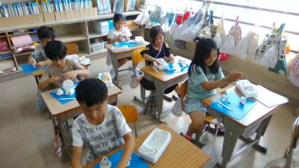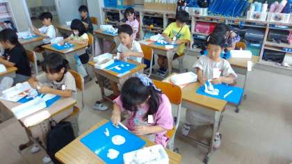 今日は、図工で、「つゆ」をテーマにねんどで作品をつくりました。