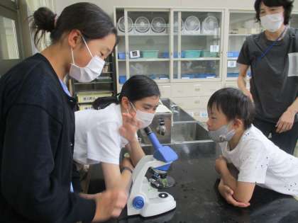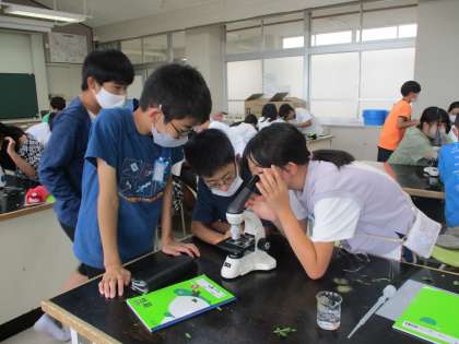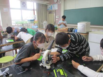 葉には、水蒸気が出ていく小さな穴、気こうがあります。葉の皮を慎重にはぎとり顕微鏡で気こうを観察しています。