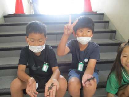 4年生の先生がアカハライモリを持ってきてくれました。アカハライモリはトカゲにに似ていますがとかげではなく、カエルの仲間だそうです。4年生には、大人気で休み時間のチャイムととともに、アカハライモリのもとに急ぎます。