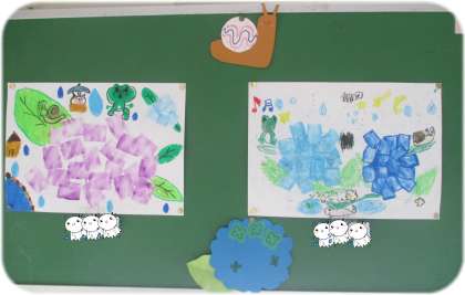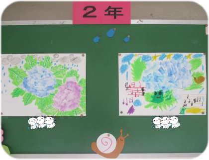 2年生の掲示板にきれいなアジサイの花が咲いています。雨の季節が楽しくなってきます。
