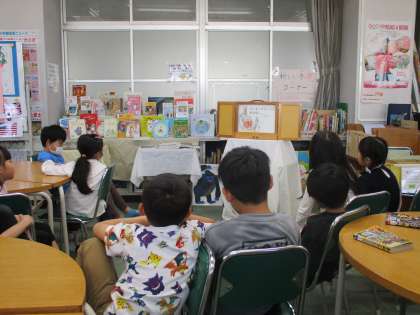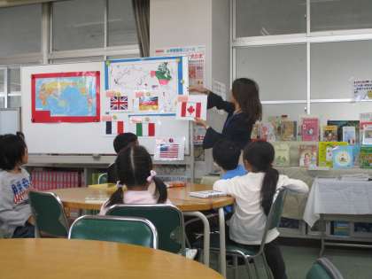 学校図書館司書さんや図書サポーターさんがG7の国の関連クイズや国旗の色ぬり、紙芝居をしてくれています。子どもたちは、フランスやドイツ、イタリアなどの国々に興味をもちました。