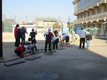 運動場の溝に溜まった砂をスッコプで取り出しています。