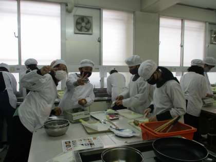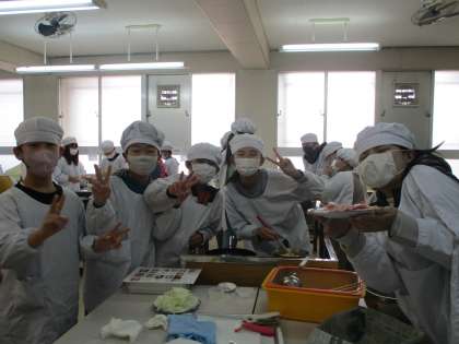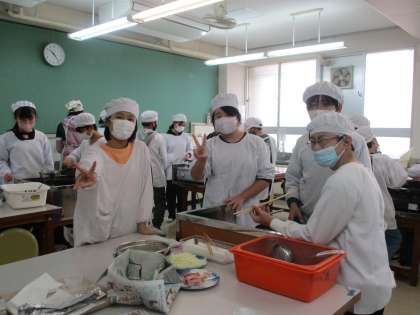 調理実習で「ベーコンポテト」に挑戦しています。材料のじゃがいもや玉ねぎを洗って切っています。仕事分担して協力しながら調理を進めています。出来上がりはきっと美味しいと思います。