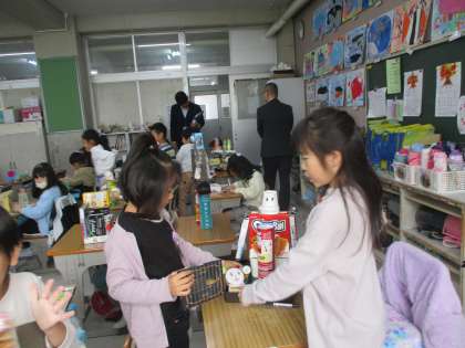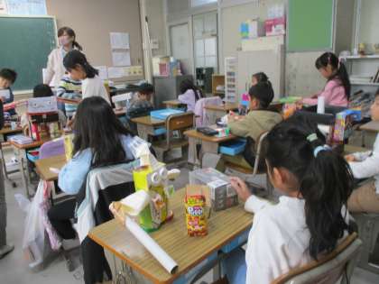箱を使って、いろいろな物を作っています。完成したら友だちと紹介し合うと楽しいでしょうね。
