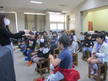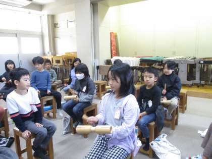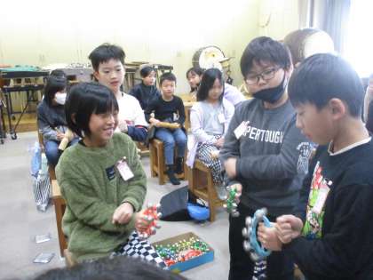 タンバリン、カスタネット、トライアングル、ウッドブロック、すず、クラベスの楽器をどんな音が出るか、順番に体験していましす。トライアングルでは、「きれい!」「やさしい音」など感想を言ってます。