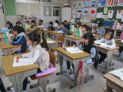「じどう車くらべ」の学習をしています。音読のあと、文中からくるまの仕事とつくりを見つけます。