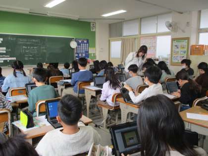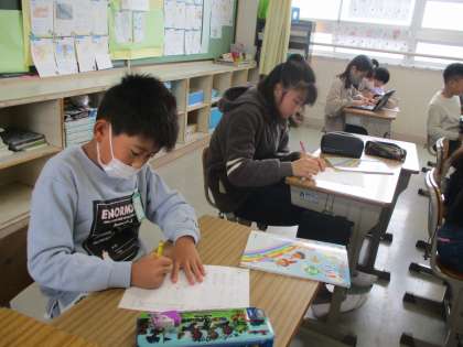 のフレーズを使って会話をします。授業の終わりには、ローマ字のプリントにも挑戦です。
