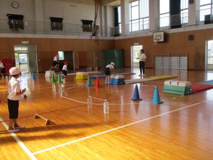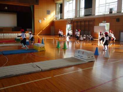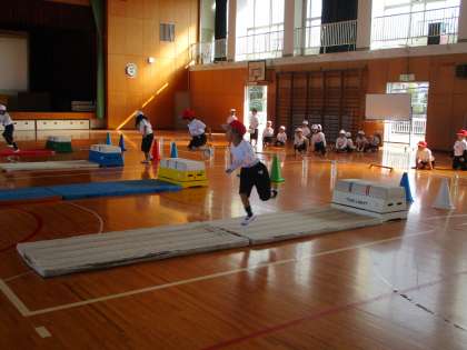 ゴムを跳んで、跳び箱を跳んで、マットの上は片足ケンケンです。しっかり体を使っています。