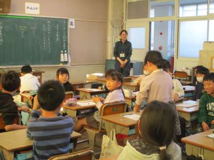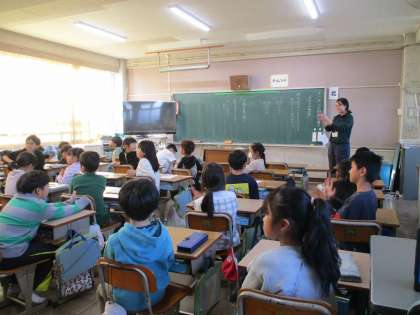 「あの子の絵の具」の学習後、友だちのいいところについて、一人ひとり発表しています。自分のいいところを言われると少し照れくさいようです。
