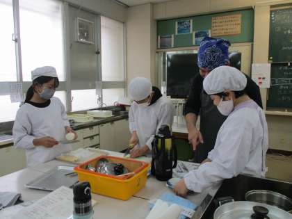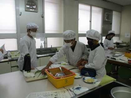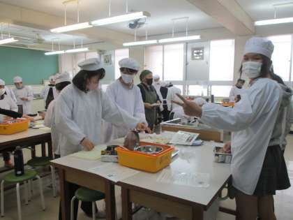 「ごはんとみそ汁」の調理実習に取り組んでいます。洗ったお米を鍋に入れ、みそ汁に入れる大根やネギを切っています。