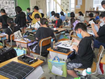 「道」の字をとめ、はね、はらいに気をつけて書いています。