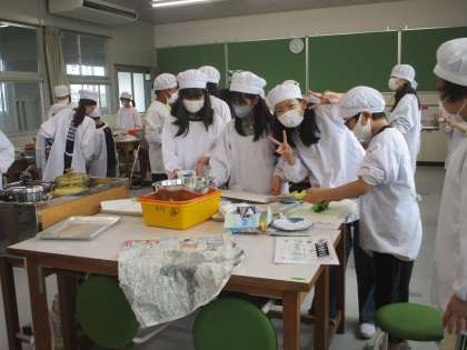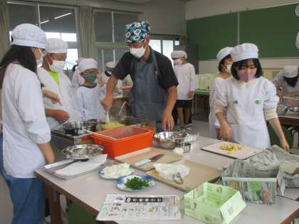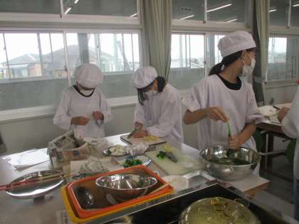 調理実習で、ごはん、みそ汁、小松菜のおひたしを作っています。