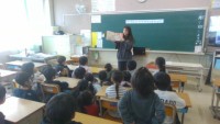 1年生が絵の具で美味しそうなお好み焼きを描いています。子どもたちにわかりやすく伝えられるように、筆洗の使い方を絵にして丁寧に示しています。