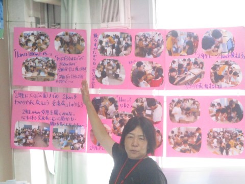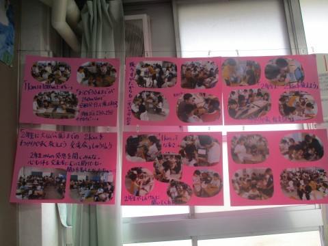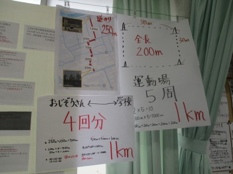 3年2組 算数「長さの学習まとめ」 公開日 2025/09/26 更新日 2025/09/26 3年生 「長さ」の単元のまとめを行っています。掲示を活用した、「学校から大仙公園までの道のり」を2年生にわかりやすく伝えた後のふりかえりの様子です。『学校からお地蔵さんまでを4回分』や『運動場5周分』など、児童に身近な道のりを用いて説明する児童の写真を提示し、3年生の子どもたちのすばらしさを価値づけています。 +1