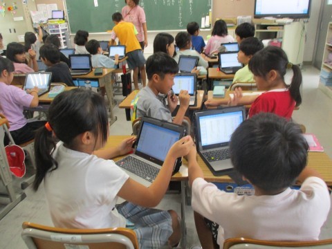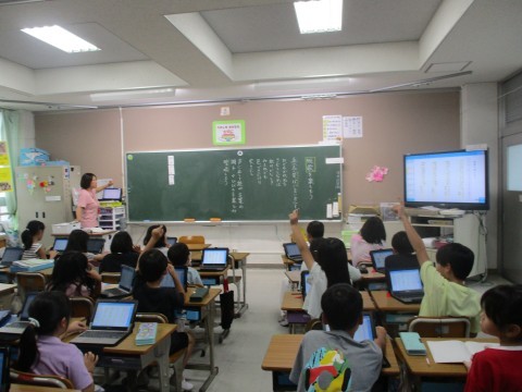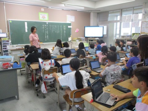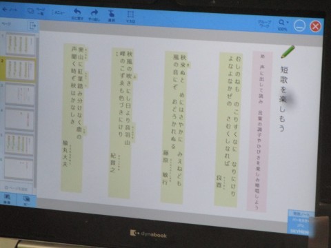短歌の言葉の調子やひびきを楽しみながら読みます。タブレットを使った授業で子どもたちの交流も活発に行われています。