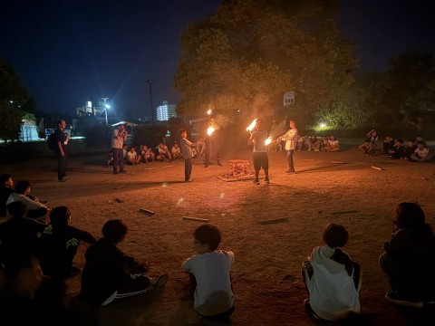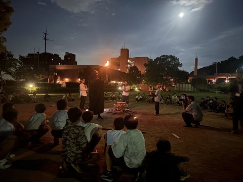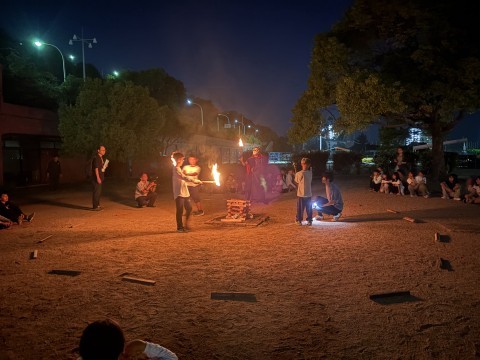 火の神の登場です。火の子が「友情の火」「助け合いの火」「協力の火」を火の神からいただいて、点火します!