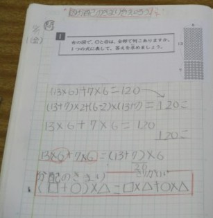 計算のきまりの中の「分配のきまり」について学んでいます。