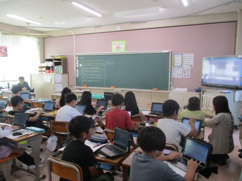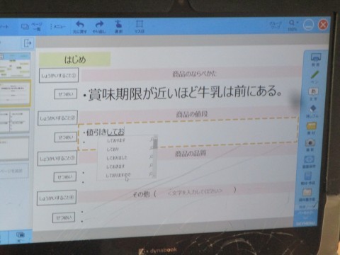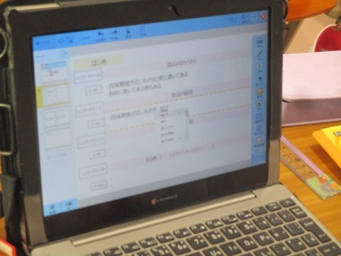 タブレットパソコンを使って,見学に行ったスーパーのいいところを紹介する文章作りをしています。