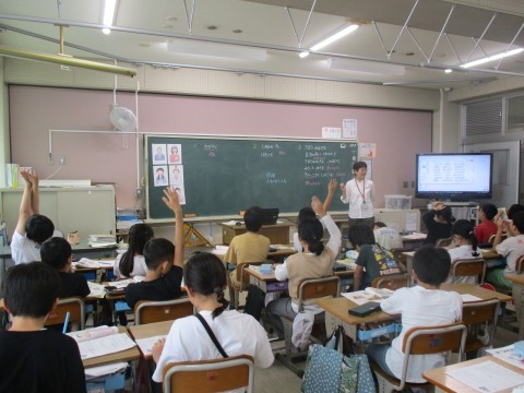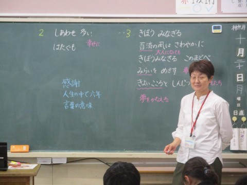 上野芝小学校の校歌の歌詞から,どんな思いが込められているかについて考えています。