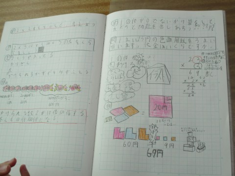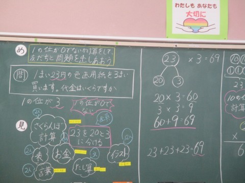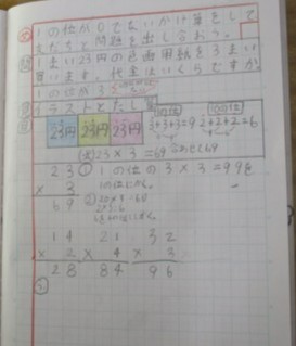 3年3組 算数「2けた×1けた」 公開日 2025/10/27 更新日 2025/10/27 3年生 「2けた×1けた」の計算の仕方について考えています。23×3の計算について,23を20と3に分けて計算しています。絵や図を描きながら,自分の考えをノートに上手にまとめていました。 +1