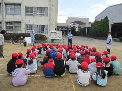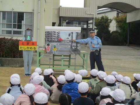 警察の方から,「とまって,たしかめる」「右・左」をしっかり見て道を渡る,見知らぬ人にはついていかないなど,自分のいのちを守るために大切なことをたくさん教わりました。