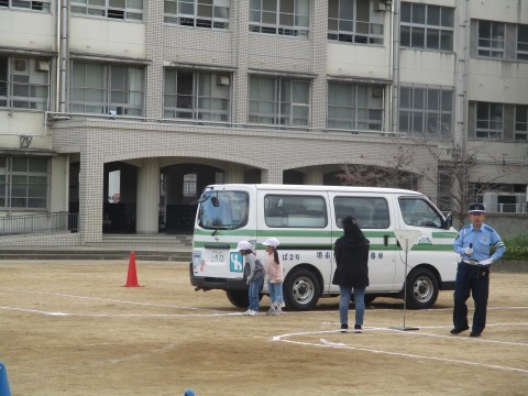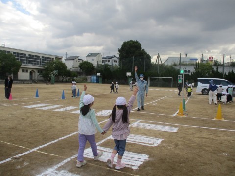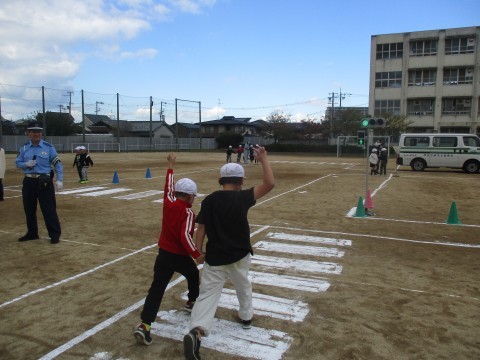 運動場で交通安全教室を行いました。1年生の歩行訓練の様子です。