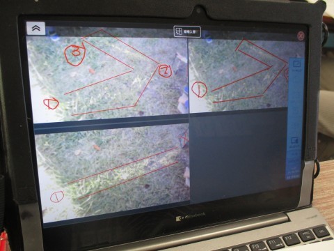タブレットで写真を撮り,はね返された光の進み方を確認しています。