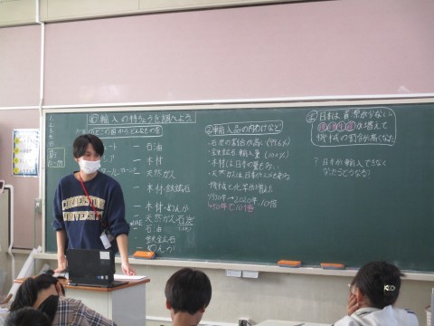 日本の輸入の特色についてグラフなどをもとに話し合っています。