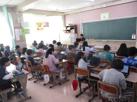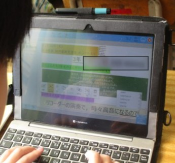 4年生との音楽交流会のふりかえりをタブレットパソコンを使って行っています。