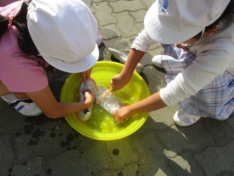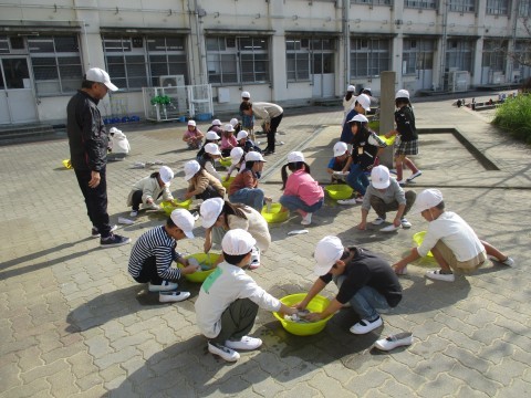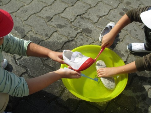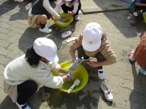 いいお天気の中,古くなったハブラシを使って自分の上靴を洗っています。