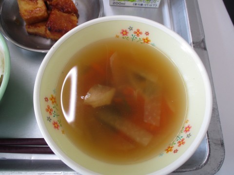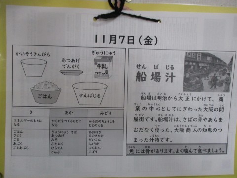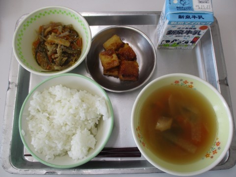 今日の献立は「ごはん・牛乳・厚揚げの田楽・海草きんぴら・船場汁」です。