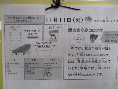 今日の献立は,「コッペパン・牛乳・堺のめぐみコロッケ・三食ソテー・ちんげんさいとうずら卵のスープ」です。