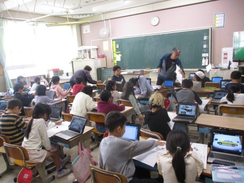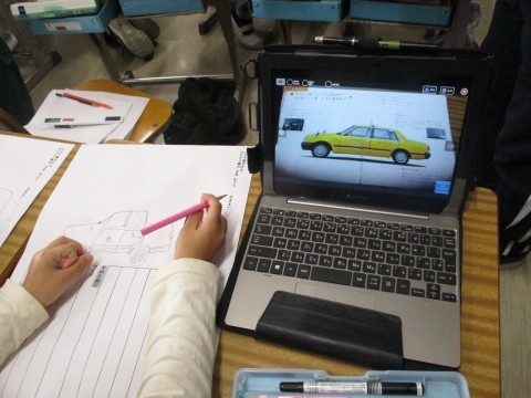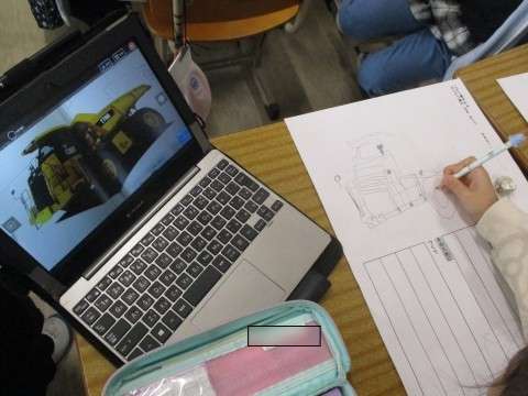 はたらく車について,その特徴について調べます。今日は自分の調べる車の絵を描いていました。