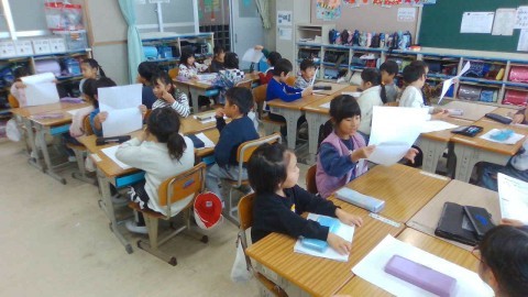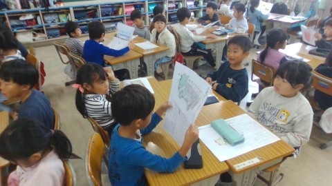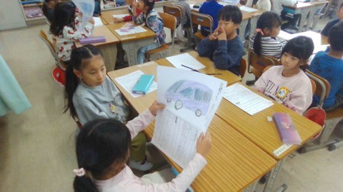 自分で気に入った自動車について本で調べたことを,絵と文でまとめて,オリジナルの自動車図鑑を作りました。今日は,全員がグループで発表して,何人かはみんなの前でも発表しました。友だちの調べた自動車の説明を聞いて「すごい!」「そんなんあるんや!」と興味津々で聞いていました。自分で必要なところを選んで書く力がついていて,とても素敵な図鑑が完成しています。