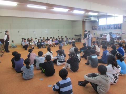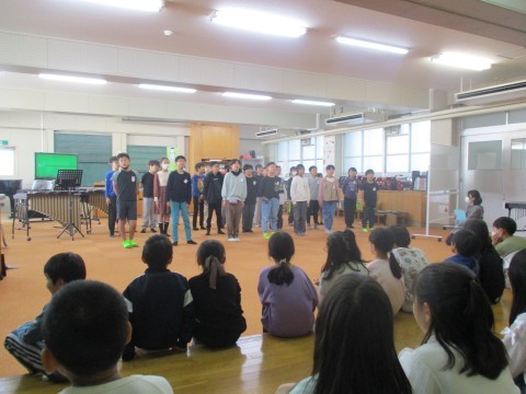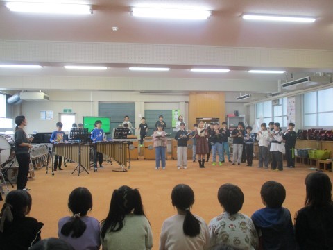 音楽室で5年3組と2年2組で音楽交流会が行っていました。