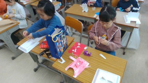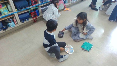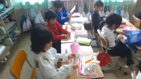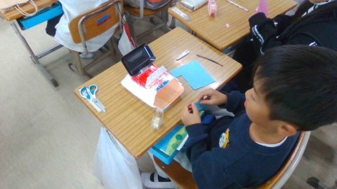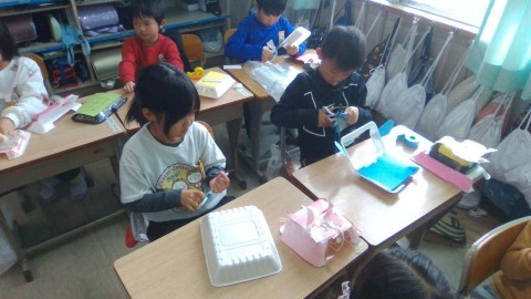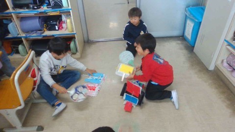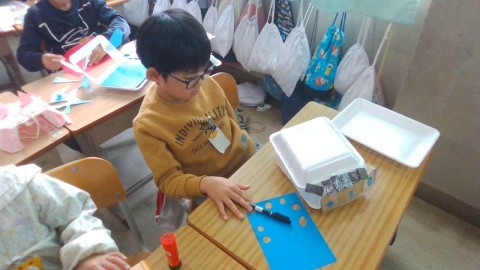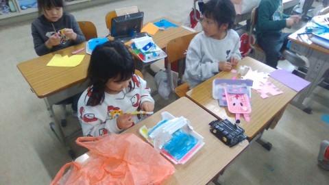 集めていただいたトレーを使って「ふわっふわっゴー」という動く作品を作りました。みんな工夫して,切り貼りして工作できました。とっても可愛く,かっこよく,楽しい作品がたくさんできました。うちわであおいでどんな動きをするのか見て,また工夫するのが楽しかったようです。また,来週持ち帰るので見てあげてください。