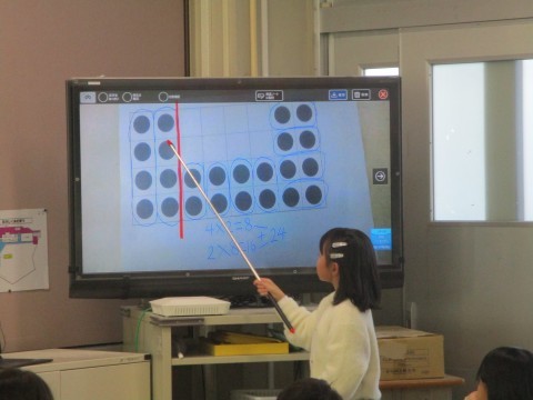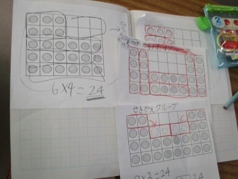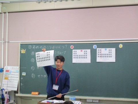 「かけ算」を使って様々な方法で問題を解決しています。教育実習生が授業を行っています。