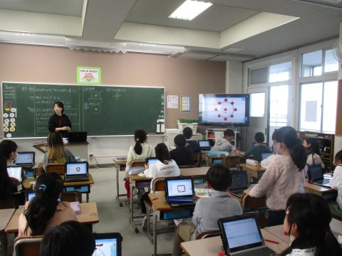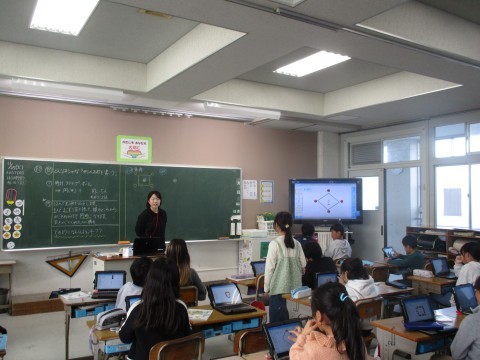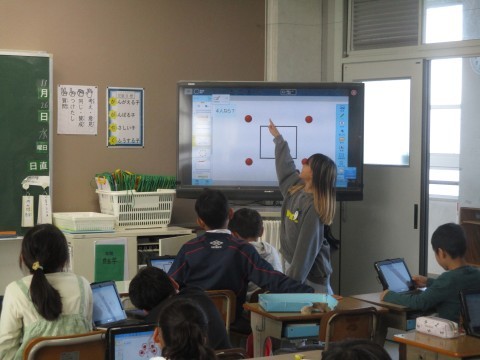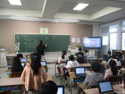 タブレットを使ってかごとの距離を同じにするようボールを配置し,前に出て発表していました。