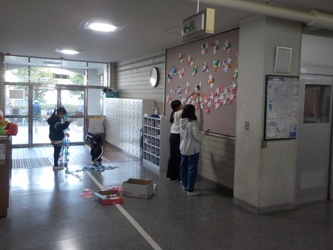 また掲示委員会は、玄関の掲示板を冬らしいかわいい装飾に仕上げていました。